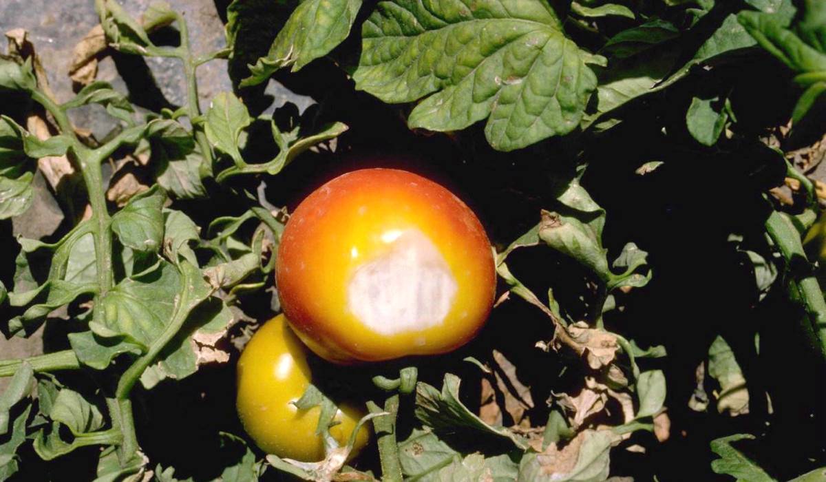 Солнечный ожог чаще всего встречается у кустов с небольшим количество листвы или у штамбовых сортов. Пока плоды незрелые, пятна водянистые, желтые. Со временем они западают внутрь и подсыхают. Если не собрать томаты с ожогами, в местах пятен появляется плесень и начинается загнивание. Чтобы избежать данной проблемы, не стоит сильно пасынковать растения. Также важно вносить удобрения, которые на начальной стадии развития культуры способствуют росту зеленой массы.