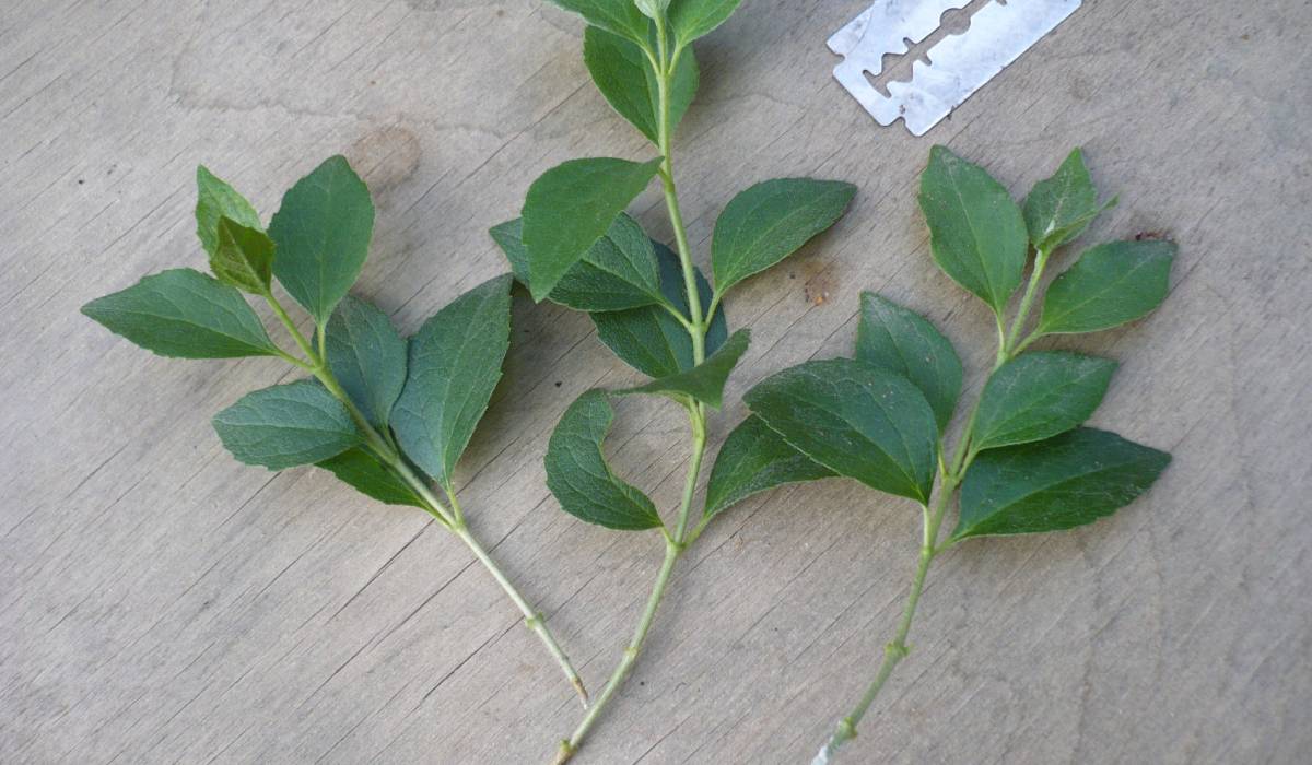 Черенки для посадки срезают во время или после цветения кустарника. Выбирают боковые, молодые, тонкие веточки с цветами. Их резким движением отламывают от куста таким образом, чтобы на конце остался кусочек коры с древесиной. Затем проводят обрезку на небольшие части длиной в 4-5 см с междоузлием и 2-3 парами листочков, которые наполовину укорачивают. Внизу делают косой срез. Если получилось, что внизу остались листья, их удаляют. Для лучшей адаптации кончики черенков на пару минут замачивают в «Корневине» или другом стимуляторе роста. Затем под наклоном их зглубляют в почву на 2-3 см. Для поддержания влажности, посадки прикрывают пластиковыми бутылками. Через 2-3 недели черенки должны пустить корни.