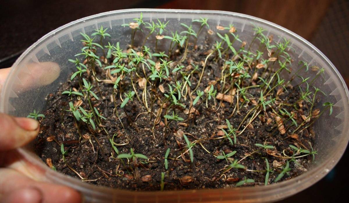 При посадке весной можно семена высаживать также сразу в открытый грунт или через рассаду. Для этого в контейнеры с почвой для хвойных культур высаживают семена на глубину до 1 см, придерживаясь расстояния 5-6 см друг от друга. Семечки слегка присыпают и орашают водой. Емкости укрывают пленкой и ставят в теплое, темное место. Когда появятся ростки, посадки переносят в более прохладное, освещенное место. Покрытие с емкости убирают. Семена должны взойти через 10-15 дней. Пока растения не начнут загущаться и давать обильную зеленую массу, их не пересаживают в отдельные горшки.