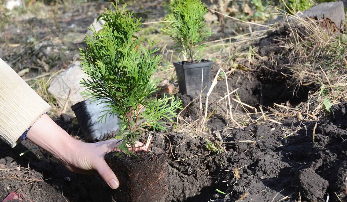 Посадку саженцев проводят на расстоянии в 1-3 метра друг от друга. Расстояние между рядами составляет 30 см. Высаживая тую, важно следить, чтобы корневая шейка выступала над поверхностью грунта на 2-3 см. После посадки землю утрамбовывают, проводят полив и выкладывают мульчу, которая поможет длительное время удерживать влагу и не даст разрастаться сорнякам.