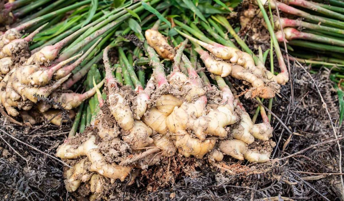 Чтобы получить большой корень, рекомендуется дать расти растению на протяжении 9-10 месяцев. К этому времени корневище нарастит большое количество новых, молодых корней. Имбирь готов к уборке, если куст перестал расти, листья пожелтели и высохли, а ветки пригнулись к земле. В таком случае за неделю прекращают полив, куст подкапывают и извлекают из почвы вместе с земляным комом. Срезают ветки, корень очищают от земли и разрезают на более мелкие части. Кусочки имбиря промывают в проточной воде и тщательно просушивают. Если необходимо длительное хранение, их можно высушить или заморозить.