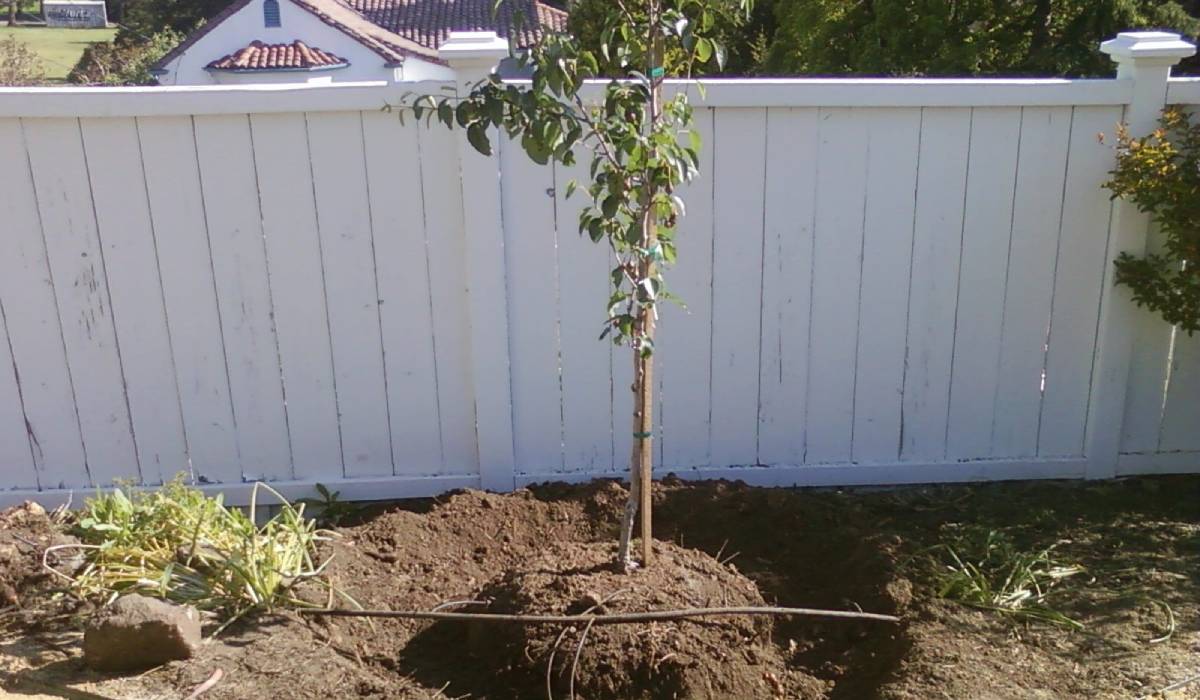 Яму выкапывают диаметром и глубиной 70-80 см. Верхний плодородный слой при копке откладывают отдельно. На дно выкладывают дренаж слоем в 10 см из щебня, гравия или битого кирпича. Затем в центр вбивают кол высотой 1,5-2 метра. Плодородный слой почвы смешивают с навозом, песком и компостом. Этой почвосмесью заполняют яму на 1/3. Затем вносят древесную золу или 2 ложки сернокислого калия или суперфосфата. Саженец устанавливают таким образом, чтобы корневая шейка возвышалась над землей на 5-7 см. Его засыпают, почву утрамбовывают и проводят полив. На одно деревце затрачивают до 20 литров воды. Проводят подвязку. Приствольный круг рекомендуется замульчировать.