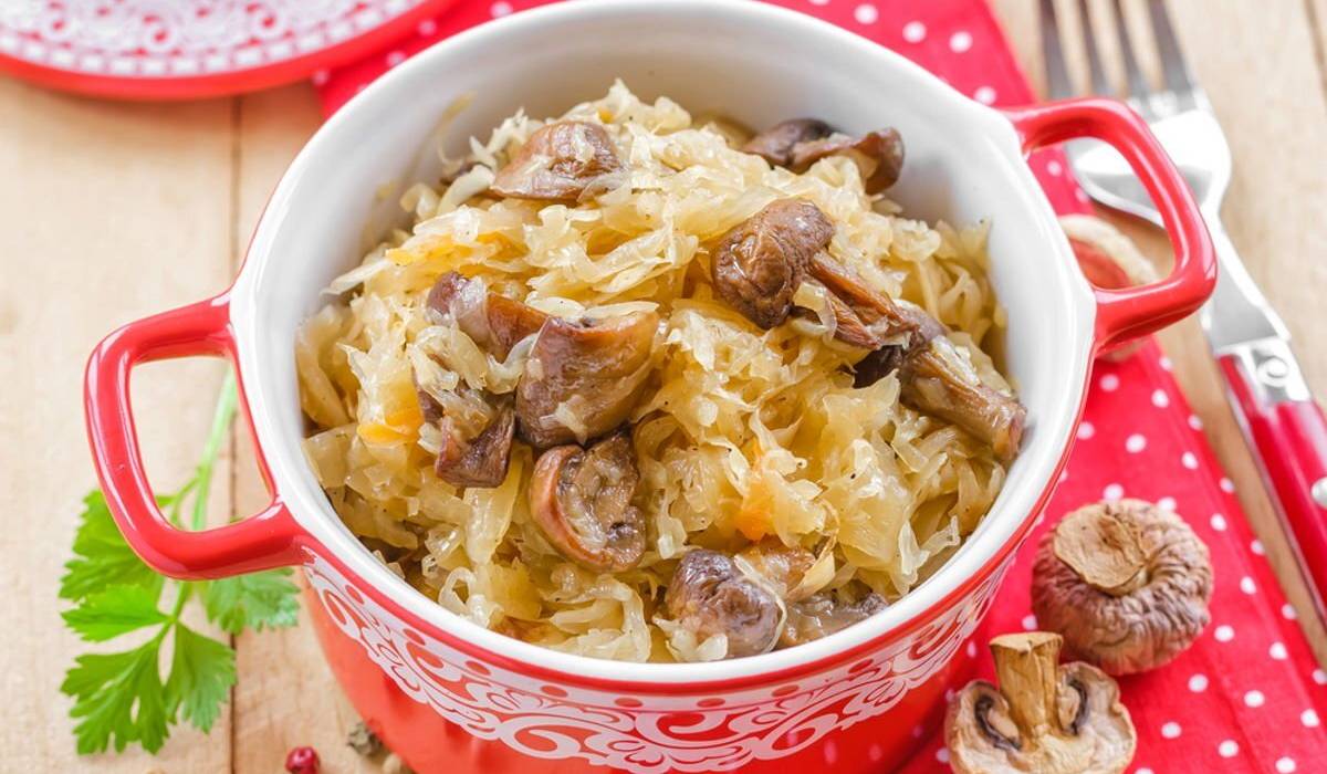 Блюдо получается пикантным и вкусным. Капусту квасят обычным способом, а затем добавляют отварные грибы.