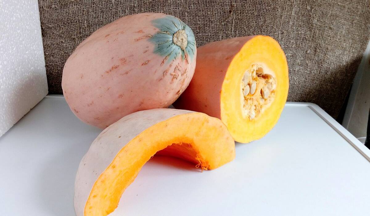 Сорт относится к среднеплетистым. Листья у растений в виде пятиугольника зеленого цвета. У Пастилы плоды напоминают эллипс. Они удлиненные, массой 2-3 кг. Кожура розоватого цвета с белым налетом. Она толстая, но не плотная. Мякоть ярко-оранжевая, сочная, мясистая. Семечки внутри мелкие, расположены глубоко вдоль всей длины овоща. Вкус у тыквы ароматный, сладкий, с нотками ванили. За счет небольших, компактных кустов плодов созревает на одном растении немного. В среднем 3-4.
